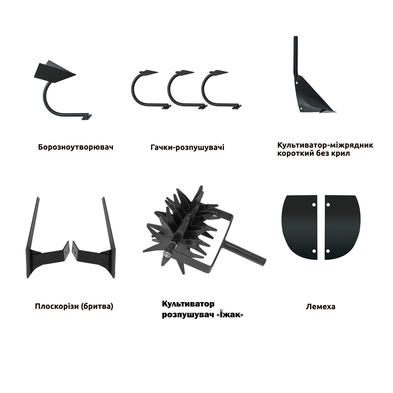 На несуче шасі залежно від виду робіт легко монтується 1 з 7 знарядь для обробки ґрунту: підгортач, культиватор розпушувач «Їжак», міжрядник, культиватор, плоскорізи, борозноутворювач з маркером, ручна картоплесаджалка.